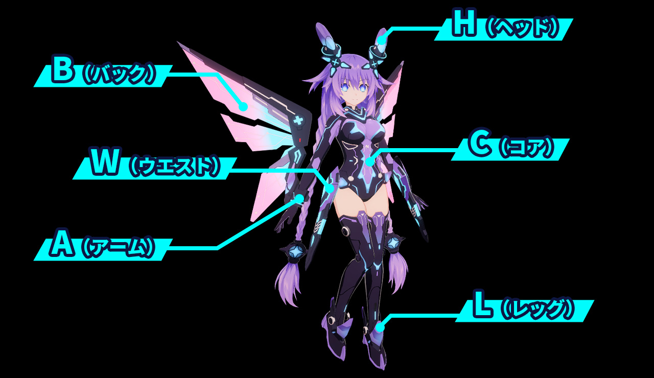 プロセッサユニットは女神専用の装備品で、C(コア)と呼ばれるボディスーツと、H(ヘッド)、B(バック)、A(アーム)、W(ウエスト)、L(レッグ)の装甲パーツからなる。