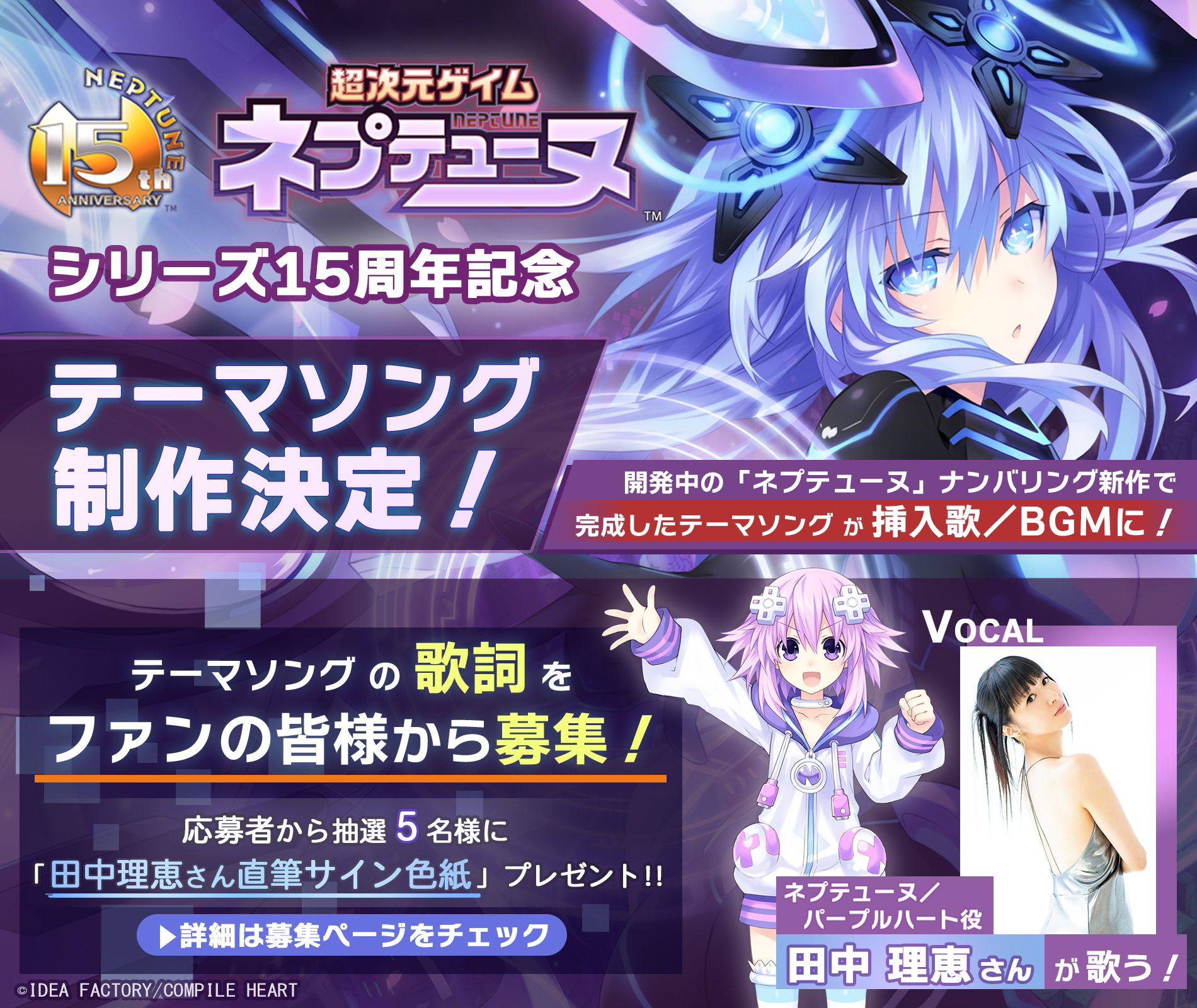 ここまで支えていただいたファンの皆様のおかげで、15周年というシリーズの新しい節目を迎えられた事を記念し、「ネプテューヌ」のテーマソングを作ることに決定しました!