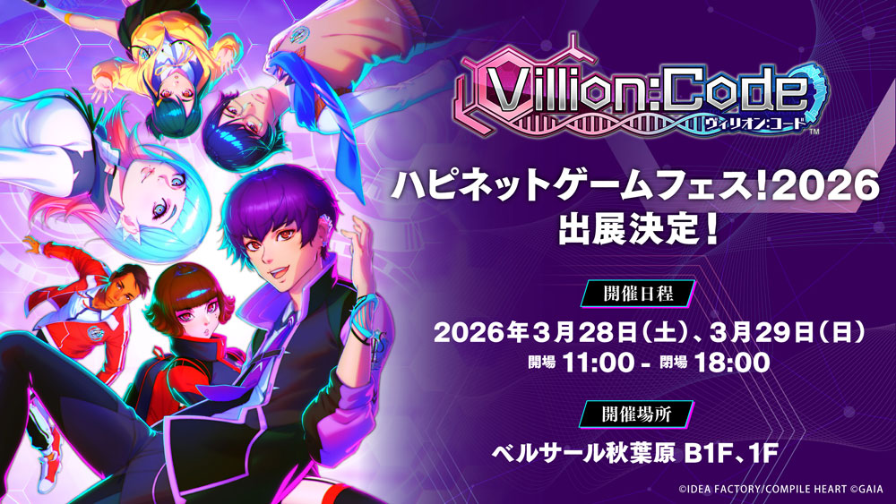 『Villion:Code』が、2026年3月28日(土)~ 3月29日(日)にベルサール秋葉原にて開催される「ハピネットゲームフェス!2026」に出展決定いたしました。