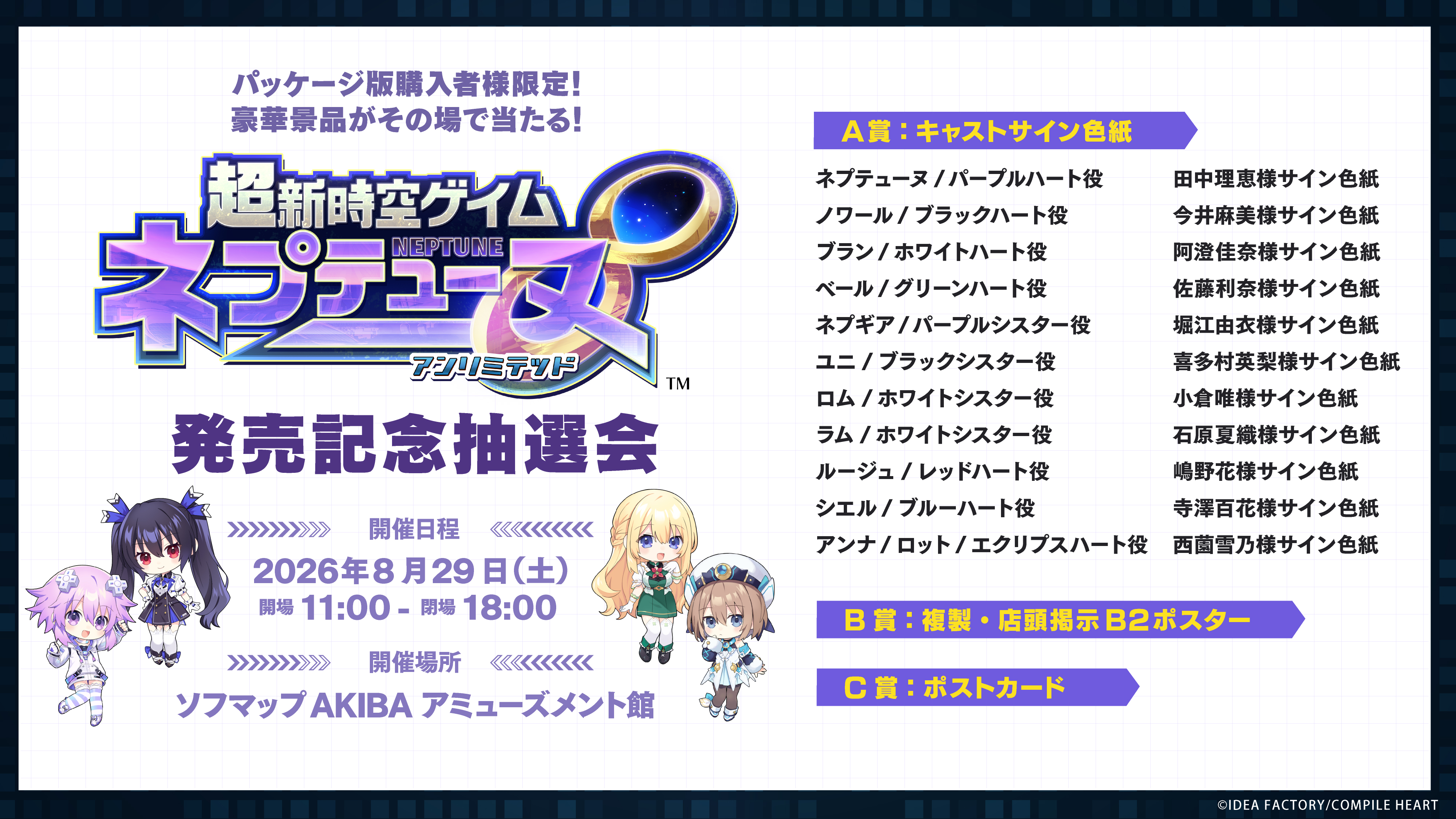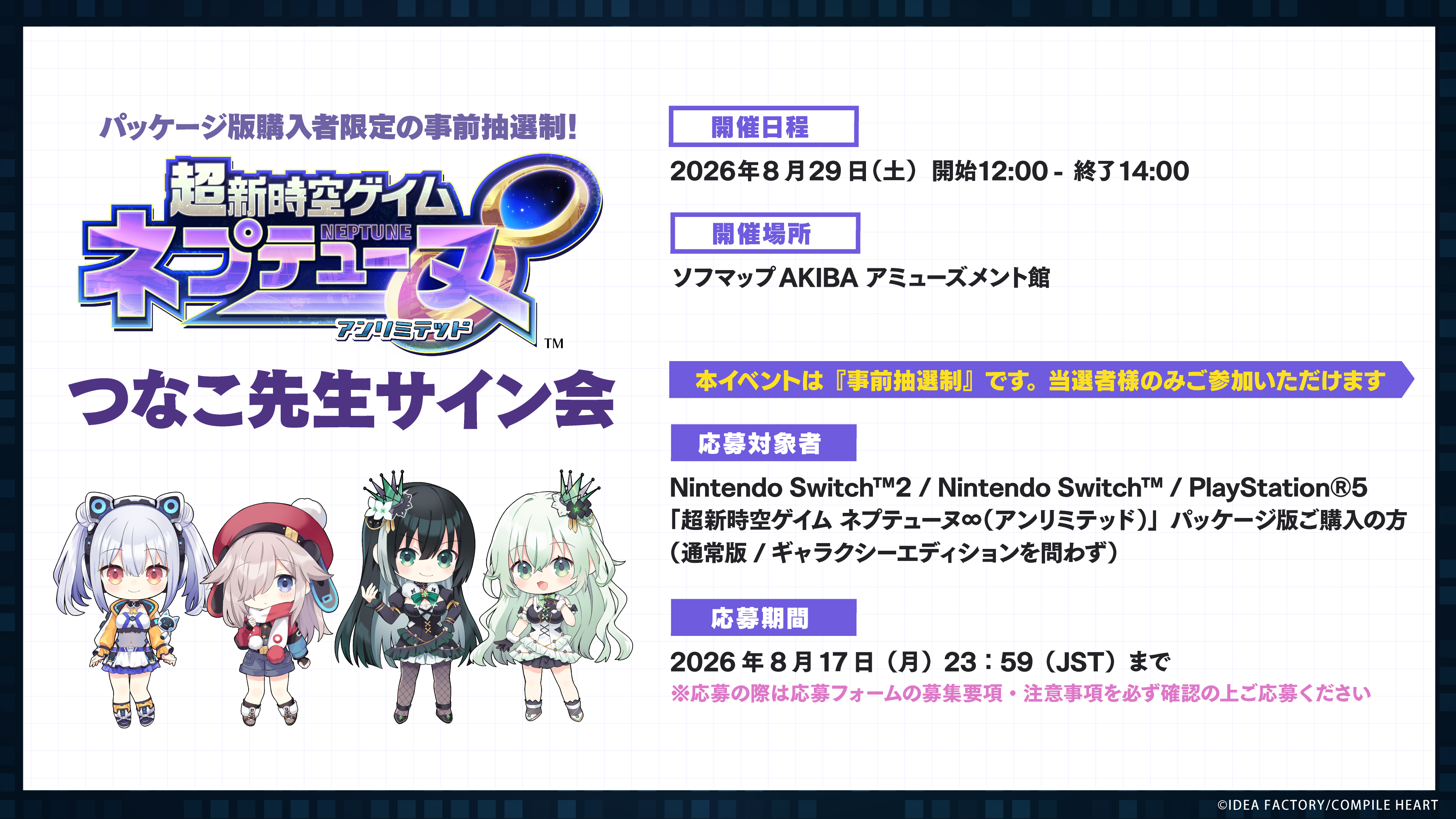 2026年8月29日(土)に、ソフマップAKIBA アミューズメント館にて『超新時空ゲイム ネプテューヌ∞(アンリミテッド)』の発売記念抽選会、およびつなこ先生サイン会の実施が決定いたしました。